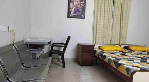 Studio room furnished with double bed, computer desk, air conditioned. This room is on terrace with Tirumala hill view. The space Room is airy and ventilated. It has dedicated bathroom outside of the room. Guest access All part of the apartment can be accessed. Other things to note No smoking and alcohol drinking.