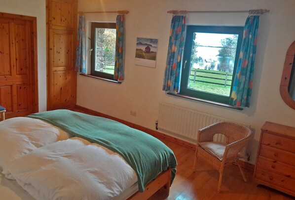 All the other rooms lead off this room. On your left you have a twin bedroom which has a cosy seating area for watching the TV (this is the only TV in the house). The TV has Irish & German channels. There is also an ensuite with shower.
