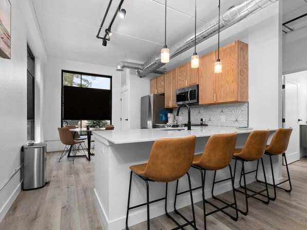 Step inside to an open concept brand new build condo that is sure to suit your needs during your stay. The kitchen is equipped with stainless steel appliances and a high top table to enjoy your home cooked meals. Enjoy natural light throughout the entire space but feel free to close the blinds for more privacy. There is a smart TV in the living room as well as a pullout sofa. The bedroom holds a comfortable king sized bed, a desk, and a smart TV for your use.