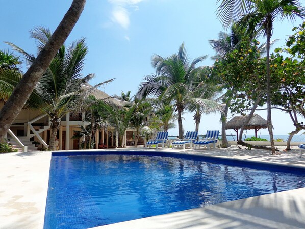 • Solstolar vid poolen för att njuta av solen eller skuggan av en av de vackra palmerna.