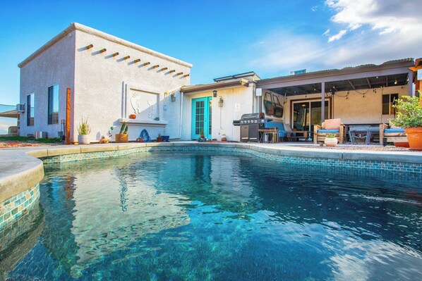 Designed for comfort, creativity, and connection, the property blends privacy, handcrafted décor, and resort-style amenities. This boutique home features a stunning custom pool, hot tub, indoor lounge areas, outdoor bar, and a flexible layout for families, friends, and more.