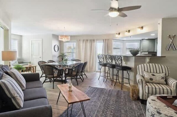 Vardagsrummet har en smart-TV. Din inre matsal har ett stort runt bord med 6 stolar och bar med 4 barstolar. Ocean View-däck har ett stort bord och 6 stolar.
