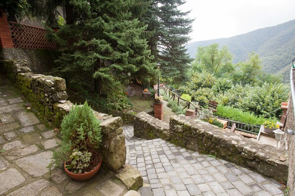 Trädgården kännetecknas av steniga väggar på flera nivåer fulla av vandringsleder med vackra blommor, kruka av örter och vingårdar täckta med pyloner. Här kan vi uppleva den härliga känslan av "gammal Italien" som varje turist vill ha. Sitter ute i en av de många bänkarna som skriver eller läser ... Detta skulle vara en perfekt plats att tillbringa en månad eller mer för en författare, målare eller någon som söker skönhet eller en plats att tänka och vara kreativ. Boveglio är en härlig medeltida by där Casa Sotto la Torre ligger, det kan nås med bil norrut i 15 kilometer på smal, SP 55 i Collodi eller söderut för 10 km på SP 55 från Bagni de Lucca. Huset ligger på SP55 precis vid nordvästra ingången till byn Boveglio. Det finns buss till och från, men det behövs en bil. Vi hittade två bra restauranger och en liten men välsorterad livsmedelsmarknad i en by som heter Benabbio, 5 kilometer norr om Boveglio. Vi älskade denna plats och när vi kommer tillbaka blir vi längre.
