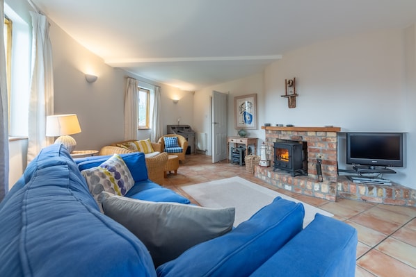 Med vedeldad spis, tv, video och musikcenter inklusive CD-spelare. Matbord och sittplatser för tio.