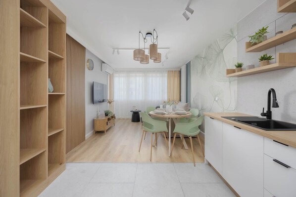 This bright and stylish apartment is an excellent place for couples, families, or business travelers who value comfort and tranquility. The 34 m² apartment can accommodate up to 4 people, providing a comfortable space for shared relaxation while also allowing for privacy when needed.