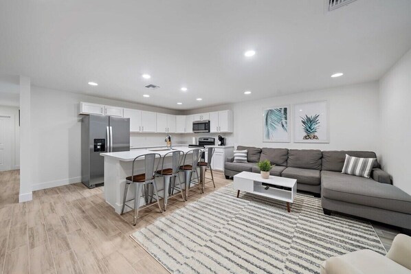 LIVING ROOM: The cozy living area has comfortable furniture, a large 55” TV you can sign in to your Amazon Prime Video, Disney+, Hulu, AppleTV, HBOMax, etc.