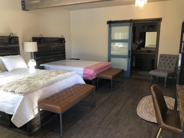 Welcome to Arrowhead Condos Unit 6, your Yellowstone retreat! A well-appointed efficiency unit similar to a traditional hotel room but with more comforts & added amenities to make it a cozy, welcoming and more personal experience! Our unique bathroom set up offers the convenience of a separate vanity area as well as two private commode areas (one includes a jetted shower/tub combo) to make space sharing easier and more comfortable. Unit 6 has two queen beds and a slim-twin daybed for additional sleep space. The unit has a desk, oversized mini-fridge & freezer, coffee supplies, microwave, luggage and closet space as well as a toasty warm fireplace to help you relax and plan your next day's activities.