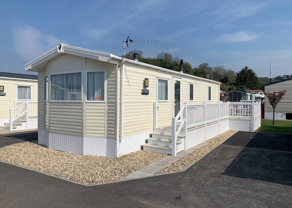 Modern and contemporary 12ft-wide caravan with one double and one twin. Shower. Open plan kitchen, living and dining area. Private decking with garden furniture.