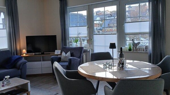 The apartment is centrally located on a quiet side street near the town center, right by the spa gardens. Attractions such as the lagoon pool, ice rink, cinema, and Ettelsberg cable car are all nearby, along with essential amenities including doctors, pharmacies, restaurants, and various shopping options. Public transportation access, bike rentals, a bakery, and cozy cafés are also within easy reach.