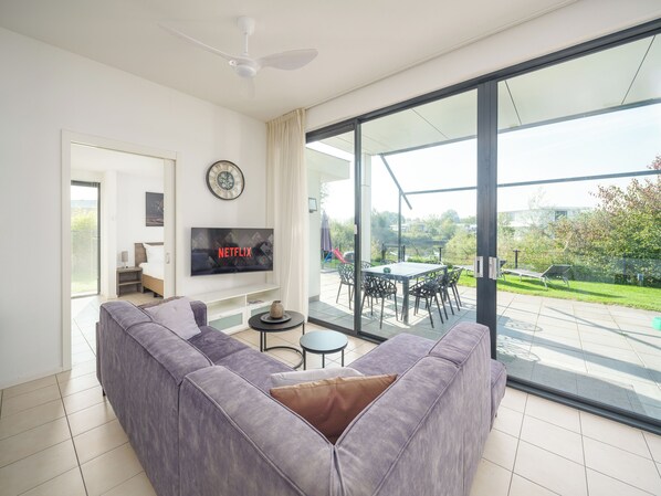Thanks to its waterfront location, the villa boasts a private jetty – ideal for a refreshing dip or to start a day on the water. In the garden, you'll find a dining table and ample space to enjoy the sun all day long. In the evening, this is the perfect spot to dine al fresco and relax together.