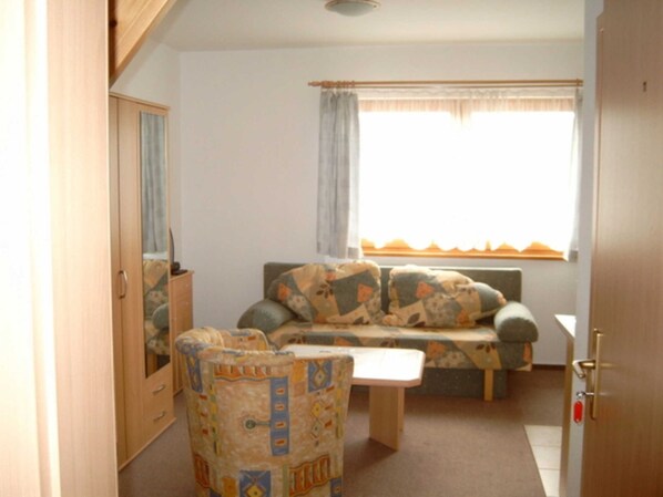 35 m² lägenhet i övervåningen-vardagsrum med utfällbar soffa, soffbord, skänk, TV / radio-integrerad i vardagsrummet är pentry: kaffebryggare, kylskåp, 2 kokplattor, vattenkokare-matbord med 4 stolar-sovrummet är åtkomligt via en Trappor (under taket), 2 sängar, liten garderob, 2 sängkåper-badkar med dusch / toalett-handdukar ska ta med sig-sänglinne kan hämtas eller hyras mot en avgift-parkeringsplats finns tillgänglig mot en avgift (1.00 & # 128; / Natt, boka detsamma) - Grill tillgänglig på en möblerad delad terrass Husdjur - Avgifter tillåtna!- Husdjurstillägg 5,00 & # 128; p samma dag