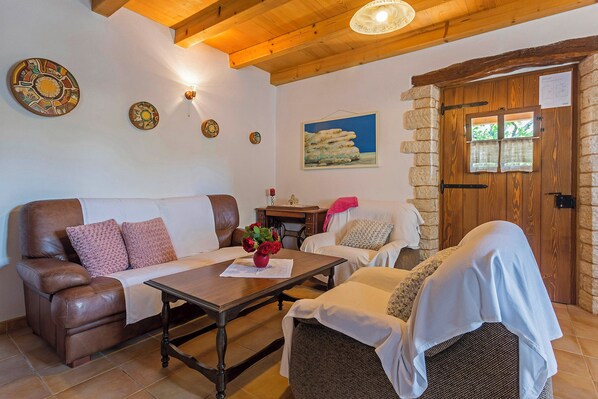 Hus för 4-5 personer: ca 65 m2 i två våningar. På bottenvåningen kök, matplats och vardagsrum med luftkonditionering och ett badrum med dusch och toalett. På vinden ett sovrum med dubbelsäng, ett sovrum med två enkelsängar och ett badrum med dusch och toalett. Det finns också en extra säng (90 x 190 cm) tillgänglig, som kan ställas in antingen i vardagsrummet eller i ett av sovrummen. Det finns också ett gemensamt rum med öppen spis.