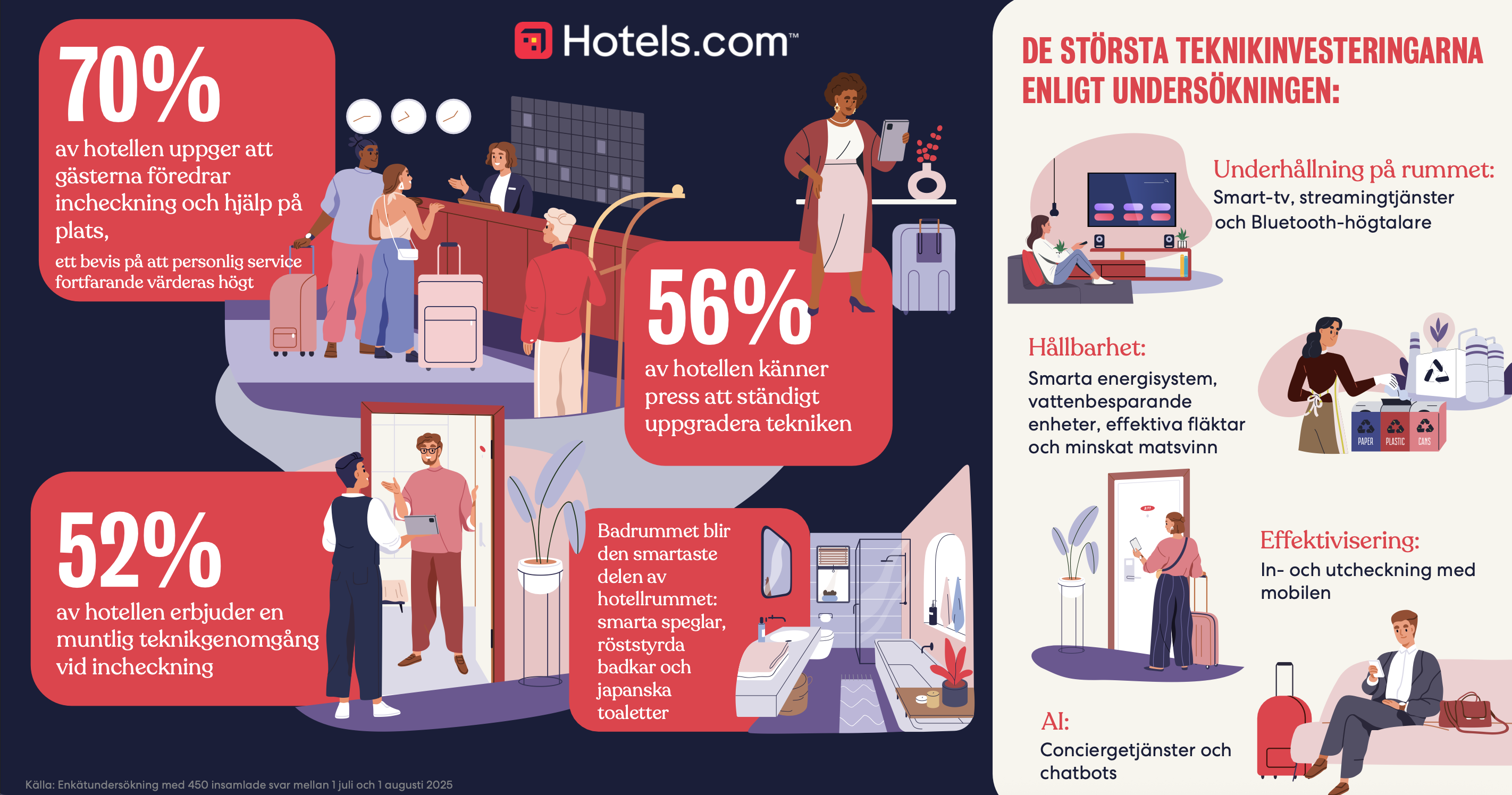 När hotellrummen blir mer sofistikerade kämpar många gäster med att hänga med. Hotellen rapporterade att gästerna oftast har problem med belysning, Wi-Fi, underhållningssystem och luftkonditionering. Därför erbjuder 52 % av hotellen nu en muntlig genomgång av tekniken vid incheckningen, vilket förtydligar vikten av mänskligt bemötande.