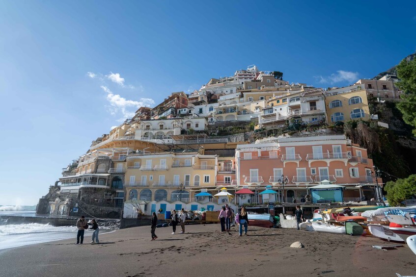 Första stoppet blir Sorrento, en charmig stad med utsikt över Neapelbukten, där du kan promenera på eleganta gator, beundra terrasser med panoramautsikt och njuta av den avslappnade atmosfären. Fortsätt längs den spektakulära kustvägen till Positano, som är känt för sin vertikala layout, färgglada hus, butiker och vykortsvackra utsikt. Ta dig tid att vandra genom smala gränder, ta fantastiska bilder eller koppla av nära stranden.
