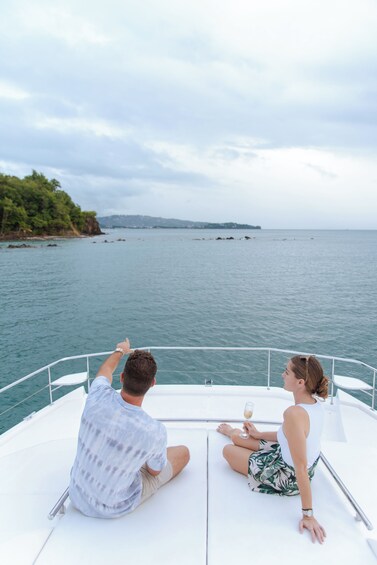 Undvik folkmassorna. En perfekt kväll börjar alltid med solnedgången. Gå ombord på din lyxiga kraftkatamaran och koppla av i ett av de många rymliga områdena runt båten. Medan du kopplar av med en cocktail i handen kryssar du längs St Lucias västkust för att upptäcka de bästa vyerna över den karibiska solnedgången. När du kryssar längs St Lucias kustlinje får du se det fantastiska ölandskapet. Njut av en mängd olika hors d'oeuvres och en champagne skål i solnedgången medan du tittar efter den svårfångade världsberömda gröna blixten.