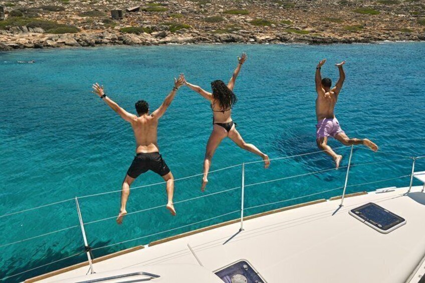 Följ med på en halvprivat morgonkryssning från Heraklion ombord på en elegant, modern katamaran. Sätt segel från Heraklion på en lyxkatamaran till Dia Island. Njut av vattenaktiviteter, simma, glida eller koppla av, och njuta av färska lokala måltider med obegränsad mängd drycker. Din morgonflykt väntar! 09:30 – Avgång från Heraklions hamn 10 :30 – Stopp i bukten Dia Island. Bad och aktiviteter på Dia Island Bay: uppblåsbar vattenrutschkana, vattentubsturer, sjöskoter, snorkling och fiskeutrustning samt ståbräda. 12:00 – Lunch ombord. Njut av en hälsosam medelhavsmåltid, skapad av en nutritionist, med ekologiska, biologiska produkter från den lokala kretensiska gården. 12:30 – Fritid, solbad, bad och andra aktiviteter 13:30 – Avgång till hamn 14:30 – Ankomst till hamn Resplanen kan ändras på grund av vädret – din komfort och säkerhet kommer alltid först.