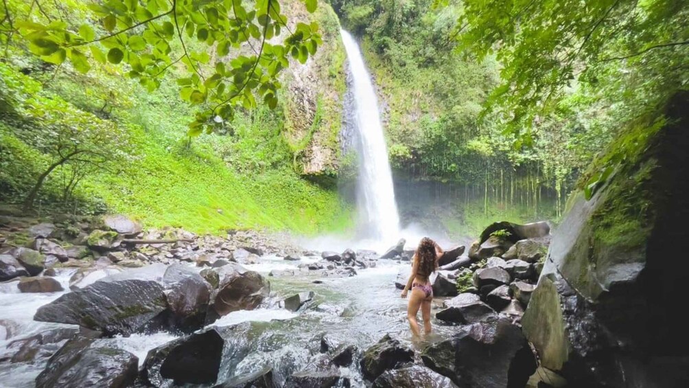 Efter upphämtning på hotellet i La Fortuna åker du iväg på en kort biltur till utgångspunkten, där du börjar med en lätt skogspromenad längs den kristallklara La Fortuna-floden. På vägen kan du hoppa på en traktorvagn som tar dig uppför en kulle till en utsiktsplats med panoramautsikt. När du har sett vattenfallet i fjärran börjar du en vandring nerför en trappa i djungeln. Halvvägs ner når du en hög hängbro som du måste ta dig över för att kunna fortsätta.