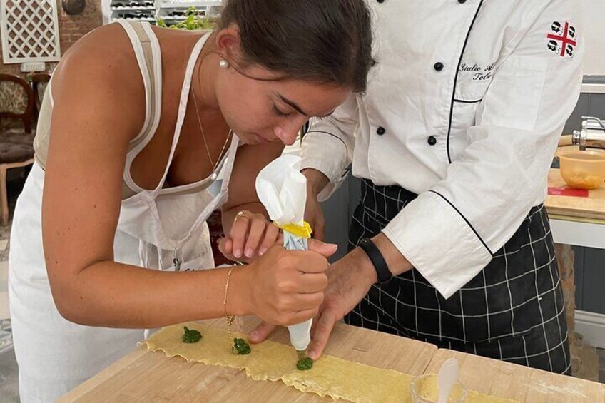 Lär dig att göra färsk pasta från grunden i Florens. Njut av ett glas vin, delta i en allsångstävling och njut av dina skapelser med en speciell pummarolasås. Upptäck glädjen med genuin italiensk matlagning i hjärtat av Florens. Följ med oss ​​på en praktisk pastakurs inspirerad av italienska mormödrar och kryddad med musik, vin och fest. Börja med ett varmt välkomnande och ett glas vin, och fördjupa dig sedan i konsten att göra färsk pasta från grunden – tagliatelle, ravioli och tortelli – med traditionella tekniker som gått i arv genom generationer. När pastan är klar fortsätter det roliga med en lekfull allsångstävling (med vinpriser!), följt av en gemensam middag där ni njuter av era skapelser med en speciell pummarolasås. Avsluta upplevelsen med musik, skratt och foton för att minnas denna autentiska bit av det italienska livet. Oavsett om du är en matälskare, en resenär eller en pastaälskare, erbjuder den här upplevelsen mer än en måltid – det är en glädjefylld hyllning till italiensk kultur.