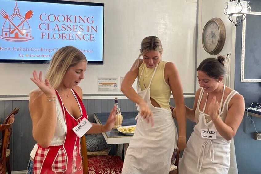 Upptäck glädjen med genuin italiensk matlagning i hjärtat av Florens. Följ med oss ​​på en praktisk pastakurs inspirerad av italienska mormödrar och kryddad med musik, vin och fest. Börja med ett varmt välkomnande och ett glas vin, och fördjupa dig sedan i konsten att göra färsk pasta från grunden (tagliatelle, ravioli och tortelli) med traditionella tekniker som gått i arv genom generationer. När pastan är klar fortsätter det roliga med en lekfull allsångstävling (med vinpriser!), följt av en gemensam middag där ni njuter av era skapelser med en speciell pummarolasås. Avsluta upplevelsen med musik, skratt och foton för att minnas denna autentiska bit av det italienska livet. Oavsett om du är en matälskare, en resenär eller en pastaälskare, erbjuder den här upplevelsen mer än en måltid: det är en glädjefylld hyllning till italiensk kultur.