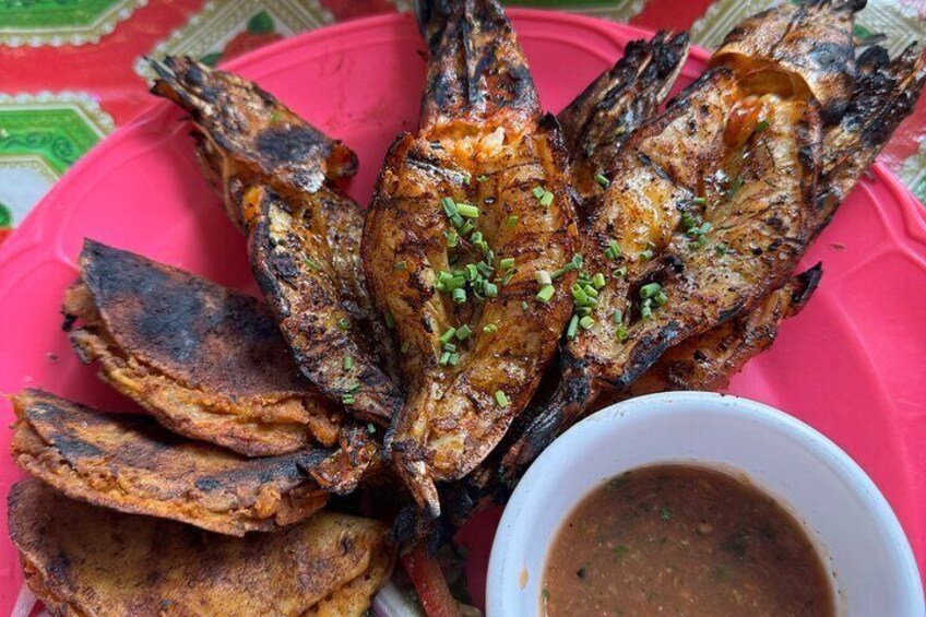 Vi kommer att besöka tre olika platser där du kommer att prova måltider med bläckfisk, marlin och räkor tillsammans med öldrycker.