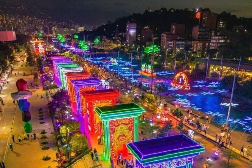 Vårt första stopp är i hjärtat av Medellín, de fantastiska flodparkerna, en plats där naturen och den urbana skönheten harmoniskt samexisterar, där staden kommer till liv med semesterns anda. Gör dig redo för en oförglömlig kväll fylld med festlig glädje, bländande ljus och glädjen i december, colombianernas favoritmånad, så kommer du att upptäcka varför!. När du går in i River Parks kommer du att mötas av en hisnande uppvisning av miljontals blinkande ljus i alla färger som pryder träden, stigarna och vattendragen. Hela parken förvandlas till ett fascinerande underland av färg och briljans, helt enkelt vackert! Vi tar en promenad runt floden och besöker alla olika julfigurer, unika ljus och speciella mönster. Medellín är världsberömt för sina julbelysning.