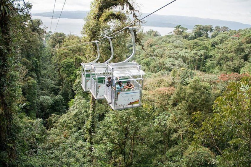 Sky Trek & Sky Tram Tours tar dig till högsta poäng i Arenal regnskog med ett äventyr full av adrenalin. Turnén börjar med en åktur på antennspårvagnen mellan den magnifika regnskogen med utsikt över Arenal vulkan och sjö. Då får du möjlighet att flyga genom en serie kablar och ha en unik upplevelse av äventyr och adrenalin i fantastiska hastigheter och höjder.