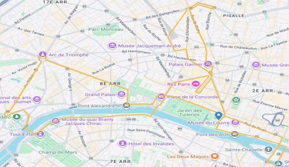 Utforska några av Paris mest berömda och glittrande platser, inklusive Opéra Garnier, Place Vendôme, Place de la Concorde, Champs-Élysées, Triumfbågen, Eiffeltornet, Les Invalides, Louvremuseet, Notre-Dame-katedralen och många fler. När lamporna är tända på natten kan du se Ljusstaden i all sin prakt.