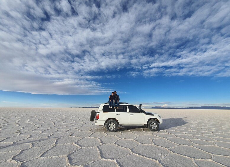 Möt din guide i Uyuni och påbörja ditt 3-dagars äventyr. Bege dig till tågkyrkogården, en kyrkogård full av övergivna tåg. Stanna till vid den lilla bosättningen Colchani, där saltgruvarbetare bodde, och handla hantverk av salt och textilkonst av lama- och alpackafibrer.